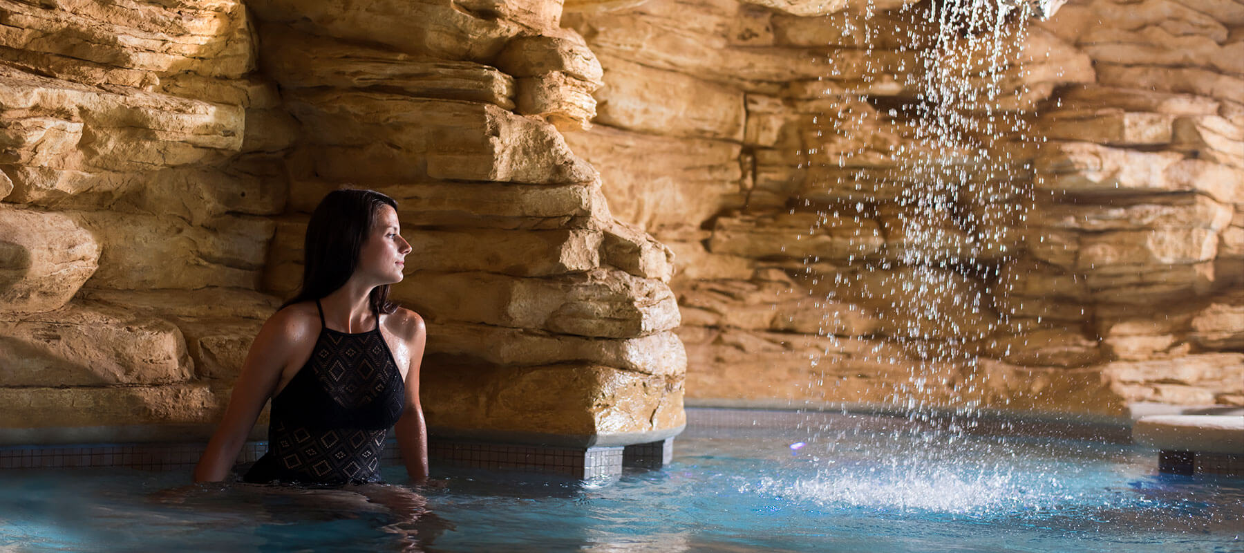 Indoor 102-degree hot soak with waterfall feature tucked into the sandstone surround.