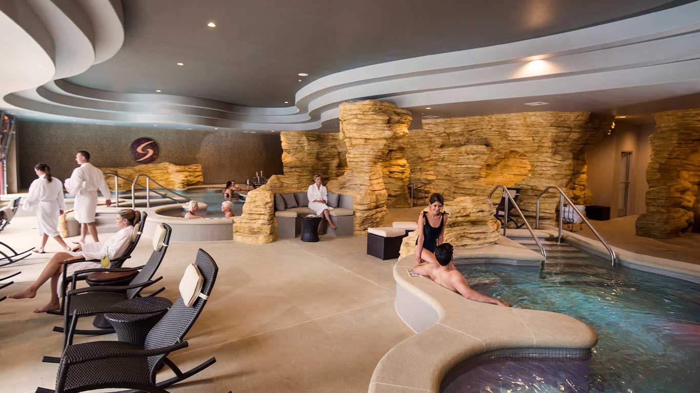Our indoor/outdoor pool in the Cambrian Oasis is the spa swim-up bar making all of your craft cocktail dreams come true. With 84-degree water and plenty of private conversation coves this pool offers a wonderful space to reconnect with loved ones. Enjoy the sandstone formations in the Cambrian Oasis in the indoor portion of the pool or swim through the door to the outdoor section with a beautiful gas fire running down the center of the pool, providing a glowing warmth and ambiance.