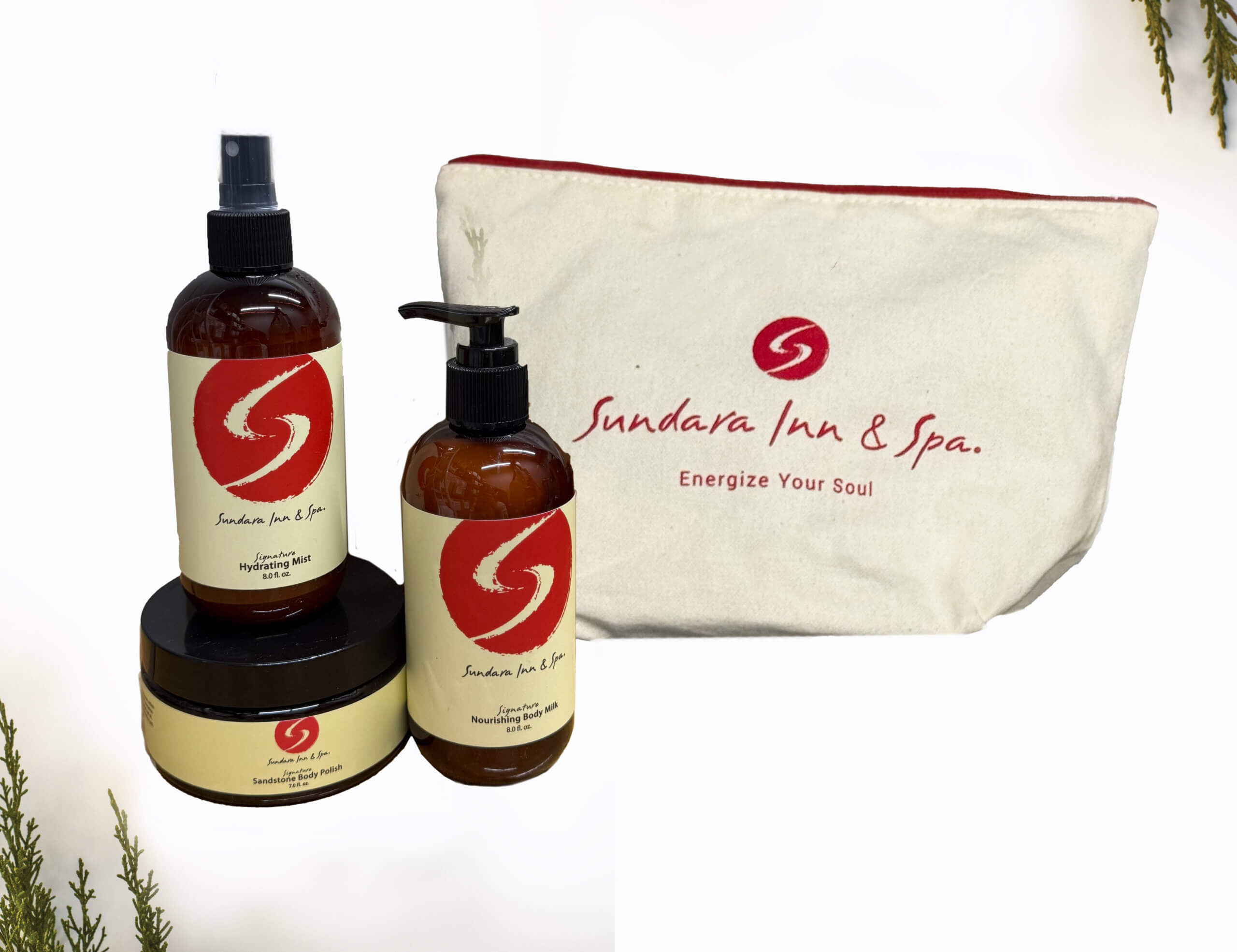 7 oz sandstone, 8oz body milk, 8 oz hydrating mist, and a large cosmetic bag