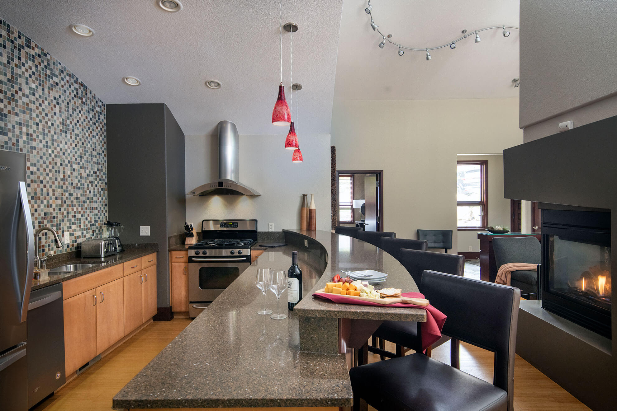 Designed for a tranquil escape or a convivial gathering, this richly appointed villa with soaring ceilings and walls of windows provides an exclusive sanctuary for visitors. Sleeps up to eight in 1,700 square feet. Soaring three-way fireplace linking the entrance, living space and gourmet kitchen.